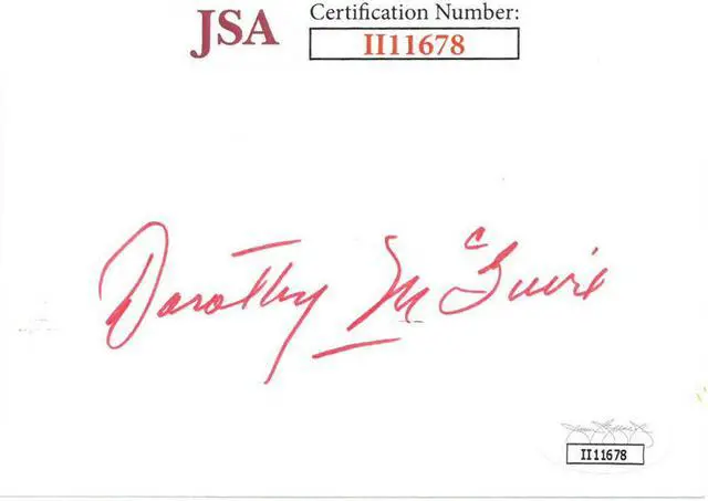 Dorothy McGuire was an American actress. She was nominated for the Academy Award for Best Actress for Gentleman's Agreement (1947) and won the National Board of Review Award for Best Actress for Friendly Persuasion. Dorothy McGuire has hand signed this 3x5 Index Card. JSA Authentication Sticker & Certificate of Authenticity #II11678