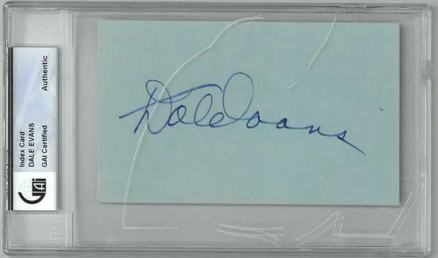 Dale Evans was an American actress, singer, and songwriter. She was the third wife of singing cowboy Roy Rogers. Dale Evans has hand autographed this 3x5 Index Card. GAI Certified Encapsulated. Cracked/Scratched case as shown, sold as is.