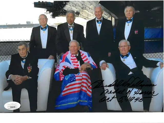 Hershel W. Williams has hand signed this 8x10 Photo with Medal of Honor Oct 5, 1945 inscriptions. JSA Authentication Sticker #JJ96453 and JSA Certificate of Authenticity