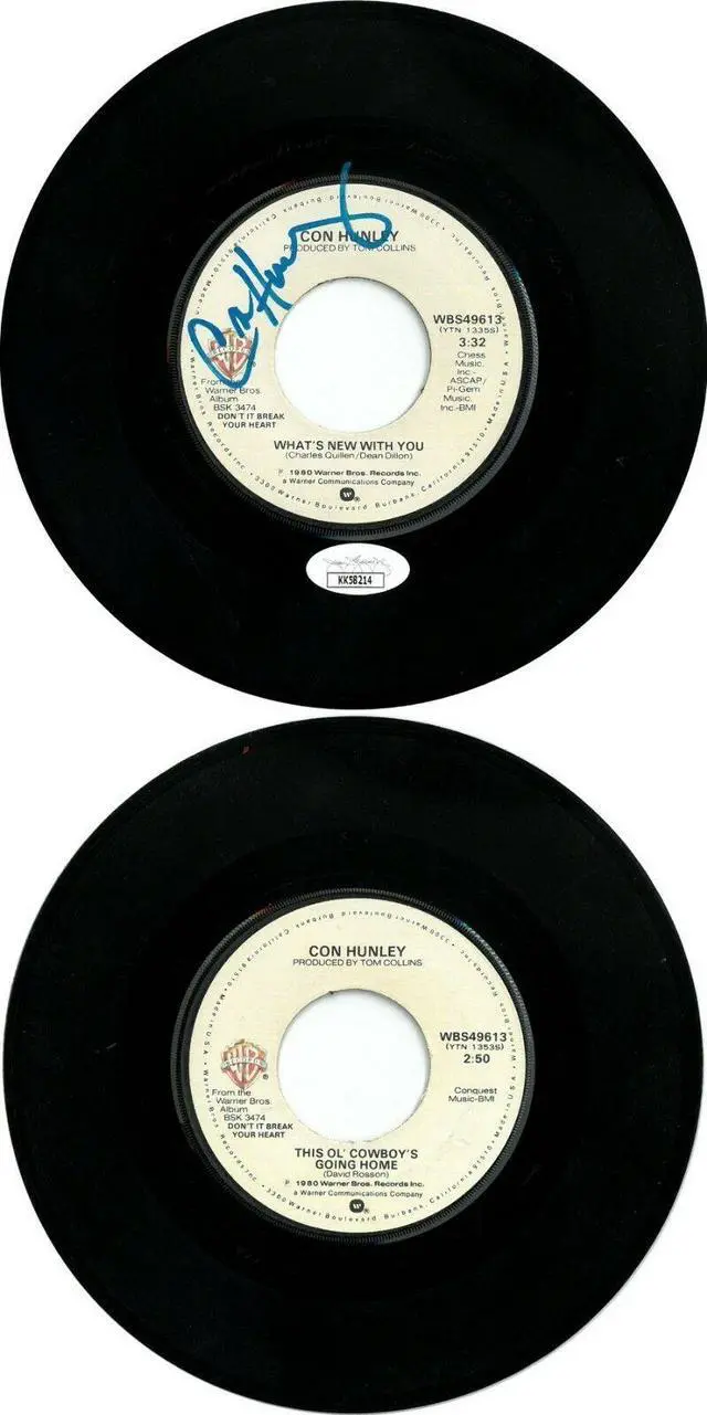 After some minor success on the country music charts, Con Hunley caught the attention of Warner Bros. Records, who signed him in 1978. Hunley recorded five albums with Warner Bros., released several singles on MCA Records and Capitol Records, and achieved more than 20 charted hits. He toured throughout the U. S., playing large venues around the country with other musical acts. Con Hunley has hand signed this 1980 What's New With You 7" 45 RPM Vinyl Record. JSA Authentication Sticker & Certificate of Authenticity #KK58214.
