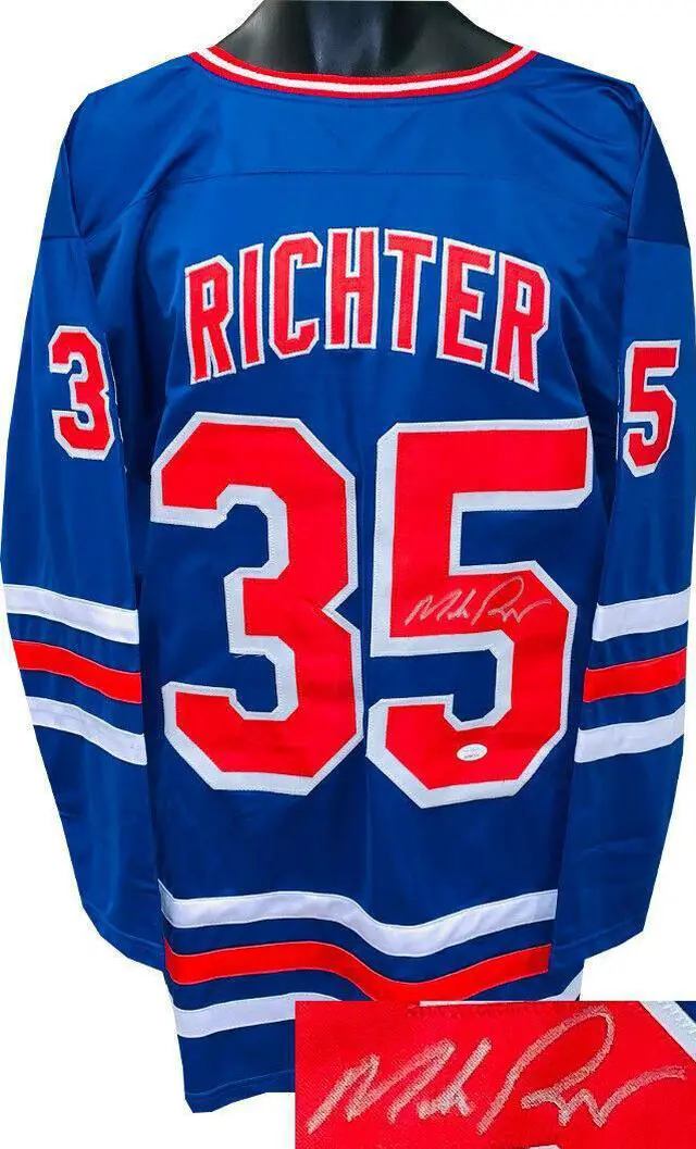 This is a new, in stock, Mike Richter signed Blue Unlicensed Custom Stitched Hockey Jersey with fully stitched twill numbers on the front and back, there are NO LICENSED TEAM LOGOS, TAGS, BRAND NAMES or PATCHES ON THIS JERSEY & IS NOT AN AUTHENTIC OFFICIALLY LICENSED JERSEY, 100% polyester, made in the Philippines. Size XL (48/50). JSA Witnessed Authentication Sticker with JSA Certificate of Authenticity.
