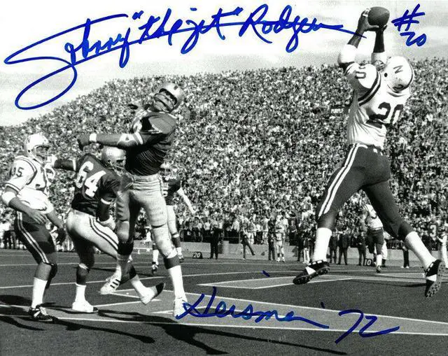 As a player with the University of Nebraska Cornhuskers, Johnny Rodgers served as a punt return specialist, pass receiver, and running back. Rodgers broke virtually every offensive team record, was twice named to the College Football All-America Team and won the Walter Camp Award and the Heisman Trophy in 1972 for most outstanding player in college football in the United States. Johnny Rodgers has hand autographed this Nebraska Cornhuskers B&W 8x10 Photo with The Jet, Heisman 72 & #20 inscriptions. Certificate of Authenticity from Athlon Sports Collectibles.