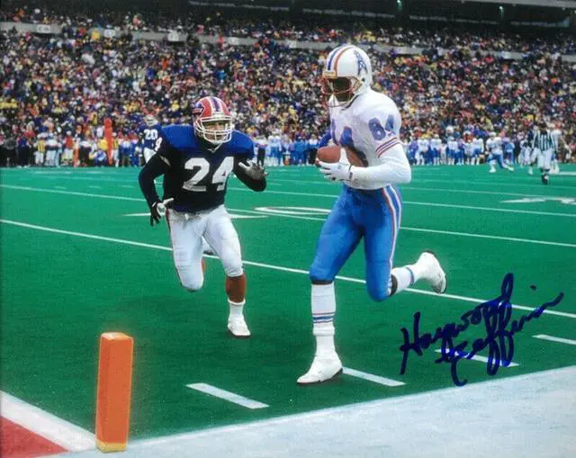 Haywood Jeffires is a former professional American football player who was selected by the Houston Oilers in the 1st round of the 1987 NFL Draft. Jeffires played in 10 NFL seasons from 1987 to 1996. He played most of his career with the Oilers during the "Run & Shoot" era with Warren Moon. A 3-time Pro Bowl selection from 1991 to 1993, Jeffires led the AFC in receptions in 1991 with 100. Haywood Jeffires has hand autographed this Houston Oilers 8x10 Photo. Certificate of Authenticity from Athlon Sports Collectibles.