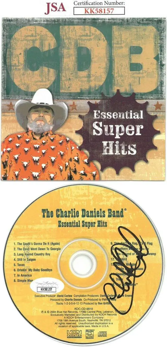 Charlie Daniels was an American musician known for his contributions to country and southern rock music. He was known primarily for his number one country hit "The Devil Went Down to Georgia", and multiple other songs he has performed and written. Daniels had been active as a singer since the early 1950s. He was inducted into the Grand Ole Opry on January 24, 2008. Charlie Daniels has hand signed this2004 Essential Super Hits Album CD w/ Cover/Case & Signed DVD (DVD is signed upside down). JSA Authentication Sticker #KK58157 with JSA Certificate of Authenticity. Handling/condition as shown.