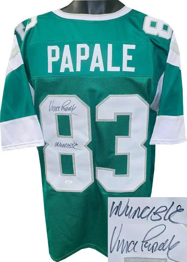 This is a new, in stock, Vince Papale signed Green Throwback unlicensed Custom Stitched Pro Style Football Jersey with Invincible inscription with fully stitched twill numbers on the front and back and players name plate, there are NO LOGOS, TAGS, BRAND NAMES or PATCHES ON THIS JERSEY & IS NOT AN OFFICIAL LICENSED JERSEY, 100% polyester, made in the Philippines. Size XL (48/50). JSA Witnessed Authentication Sticker with JSA Certificate of Authenticity.