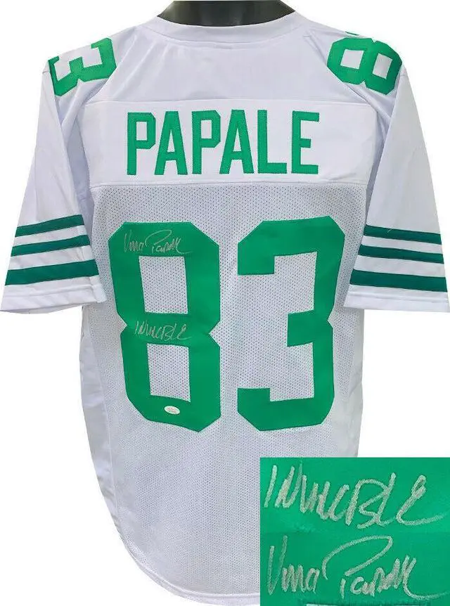 This is a new, in stock, Vince Papale signed White Throwback unlicensed Custom Stitched Pro Style Football Jersey with Invincible inscription with fully stitched twill numbers on the front and back and players name plate, there are NO LOGOS, TAGS, BRAND NAMES or PATCHES ON THIS JERSEY & IS NOT AN OFFICIAL LICENSED JERSEY, 100% polyester, made in the Philippines. Size XL (48/50). JSA Witnessed Authentication Sticker with JSA Certificate of Authenticity.