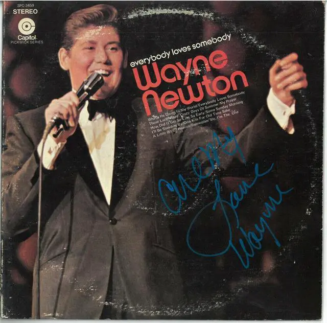 Wayne Newton has hand signed this 1967 Everybody Loves Somebody Album Cover/LP/Vinyl/Record with All My Love inscription. JSA #JJ96574 with JSA Certificate of Authenticity. Vinyl records ARE INCLUDED with the signed album cover. We cannot offer an accurate condition grade or assessment regarding either the cover or vinyl record/disc condition. All album covers and vinyl records/discs are in USED condition and will show some signs of handling/wear as shown.