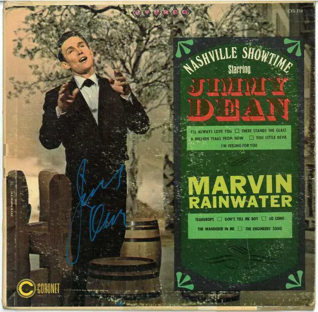 Jimmy Dean was an American country music singer, television host, actor, and businessman. He was the creator of the Jimmy Dean sausage brand as well as the spokesman for its TV commercials. Jimmy Dean has hand signed this 1960's w/ Marvin Rainwater Nashville Showtime Album Cover/LP/Vinyl Record. JSA Authentication Sticker #JJ96529 with JSA Certificate of Authenticity. Vinyl records ARE INCLUDED with the signed album cover. We cannot offer an accurate condition grade or assessment regarding either the cover or vinyl record/disc condition. All album covers and vinyl records/discs are in USED condition and will show some signs of handling, as shown.
