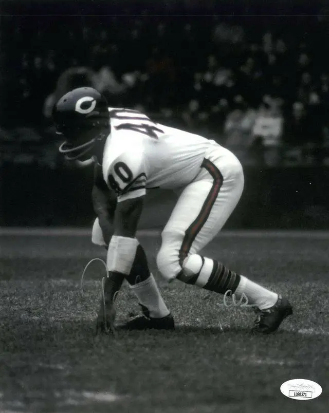 Gale Sayers was, is and will always remain a Chicago Bears legend. Despite a career cut short by knee injuries, the star running back amassed 9, 435 yards, 4, 935 of them rushing, and scored 336 points. He won Rookie of the Year honors in 1965, played in four Pro Bowls and was enshrined in the Hall of Fame in 1977. Gale Sayers has hand autographed this Chicago Bears 8x10 Photo. JSA Authentication #LL60571 and Certificate of Authenticity. Light silver sig-reduced.