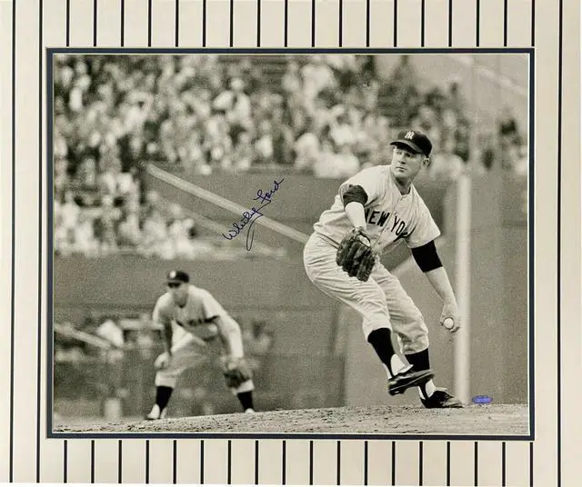 Whitey Ford spent his entire 18-year career and won 236 games for the New York Yankees. He was a 8 time All-Star selection, a 6 time World Series champion, won the 1961 Cy Young Award, and won the 1961 World Series MVP. He was voted into the Baseball Hall of Fame in 1974 and the Yankees retired his number 16. Whitey Ford has hand signed this New York Yankees Vintage B&W 16x20 Photo w/ Premium Pinstripe Matted to overall size 20x24. Steiner Hologram and Certificate of Authenticity from Athlon Sports Collectibles