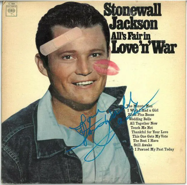 Stonewall Jackson is an American country music singer, guitarist and musician who achieved his greatest fame during country's "golden" honky tonk era in the 1950s and early 1960s. Stonewall Jackson has hand signed this 1966 All's Fair in Love 'n' War Album Cover/LP/Vinyl Record with Love inscription. JSA Authentication Sticker & Certificate of Authenticity #JJ96566. Vinyl records ARE INCLUDED with the signed album cover. We cannot offer an accurate condition grade or assessment regarding either the cover or vinyl record/disc condition. All album covers and vinyl records/discs are in USED condition and will show some signs of handling/wear as shown.