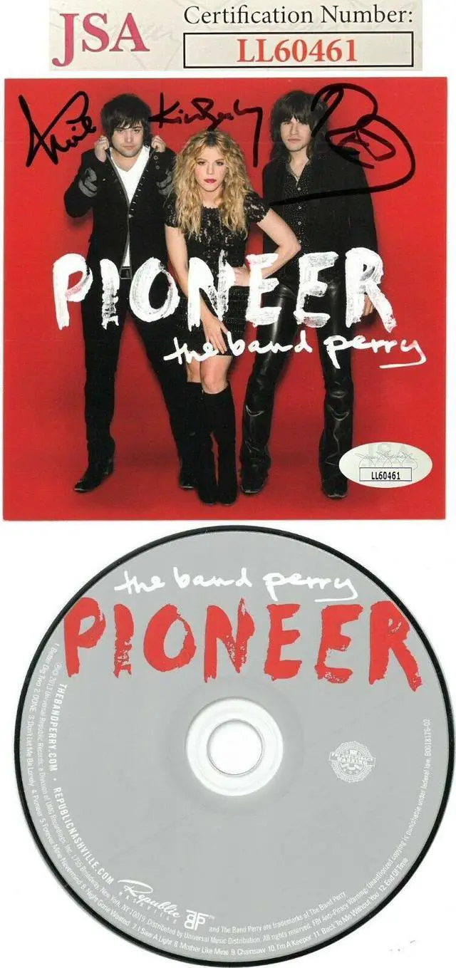 The Band Perry is a music group composed of siblings Kimberly Perry, Reid Perry, and Neil Perry. Their second album, Pioneer, was released April 2, 2013. It produced additional number one singles in "Better Dig Two" and "Done", plus the top 10 hits "Don't Let Me Be Lonely" and "Chainsaw". Kimberly Perry, Reid Perry and Neil Perry have all hand signed this 2013 Pioneer Album Cover w/ CD & Case. JSA Authentication Sticker #LL60461 and JSA Certificate of Authenticity. Handling/condition as shown.