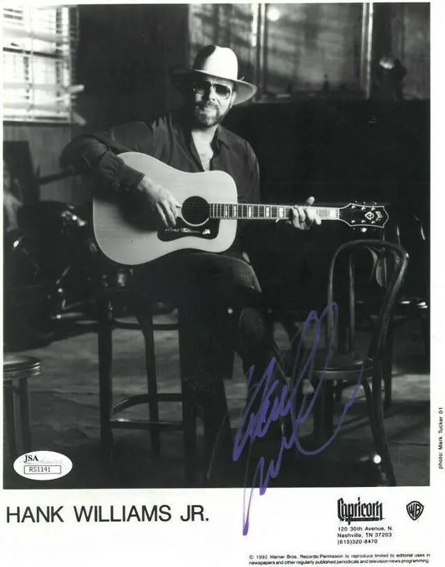 Hank Williams Jr. is an American singer-songwriter and musician. His musical style is often considered a blend of Southern rock, blues, and traditional country. He is the son of country music singer Hank Williams and the father of Hank Williams III and Holly Williams. From 1989 until October 2011 and again since 2017, [4] a version of his song "All My Rowdy Friends Are Coming Over Tonight" was refashioned to "All My Rowdy Friends Are Here on Monday Night" for use as the opening for broadcasts of Monday Night Football. Hank Williams has hand signed this B&W 8x10 Photo.