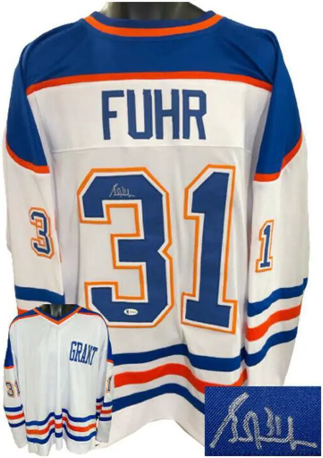 This is a new, in stock, Grant Fuhr signed White Throwback Unlicensed Custom Stitched Hockey Jersey #31 with fully stitched twill numbers on the front and back, there are NO LICENSED TEAM LOGOS, TAGS, BRAND NAMES or PATCHES ON THIS JERSEY & IS NOT AN AUTHENTIC OFFICIALLY LICENSED JERSEY, 100% polyester, made in the Philippines. Size XL (48/50). Beckett Witnessed Authentication Sticker and Certificate of Authenticity.
