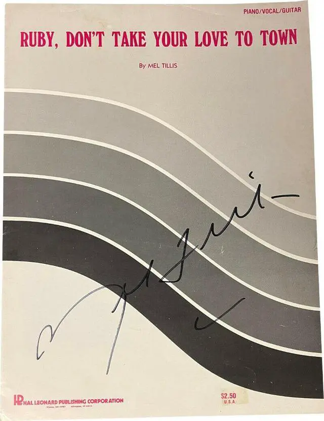 Ruby, Don't Take Your Love to Town" is a song written by Mel Tillis about a paralyzed veteran who lies helplessly as his wife "paints [herself] up" to go out for the evening without him; he believes she is going in search of a lover. Mel Tillis has hand signed this 1966 Vintage Ruby, Don’t Take Your Love To Town, 9x12 Full 4-page Sheet Music Book, very minor imperfections. Certificate of Authenticity from Athlon Sports Collectibles.