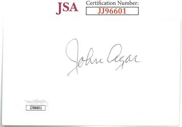 John Agar was an American film and television actor. He is best known for starring alongside John Wayne in the films Sands of Iwo Jima, Fort Apache, and She Wore a Yellow Ribbon. John Agar has hand signed this 3x5 Index Card. JSA Authentication Sticker #JJ96601 & JSA Certificate of Authenticity.