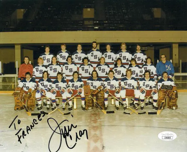 defeated Finland, 4-2, in the Olympic final and captured Olympic gold. Jim Craig has hand signed this 1980 Team USA Olympic Hockey 8x10 Photo with to Frances inscription. JSA Authentication Sticker #JJ96505 and JSA Certificate of Authenticity