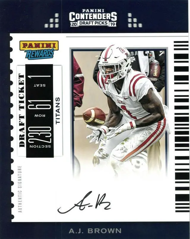 AJ Brown was drafted by the Titans in the second round of the 2019 NFL Draft. Hemade his NFL debut in the Titans' season-opener against the Cleveland Browns. During Week 4 against the Atlanta Falcons, he caught his first two NFL touchdowns from Marcus Mariota in the 24–10 road victory. In his rookie season, Brown finished with 52 receptions for 1, 051 receiving yards and eight receiving touchdowns. AJ Brown has hand autographed this Panini Contenders 2019 Draft Picks Rewards 8X10 Photo- Panini Authentic signature.