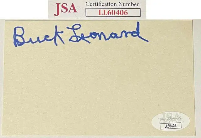 Buck Leonard was an American first baseman in Negro league baseball and in the Mexican League. After growing up in North Carolina, he played for the Homestead Grays between 1934 and 1950, batting fourth behind Josh Gibson for many years. The Grays teams of the 1930s and 1940s were considered some of the best teams in Negro league history. Buck Leonard has hand signed this 3x5 Index Card. JSA Authentication Sticker #LL60406 and JSA Certificate of Authenticity.