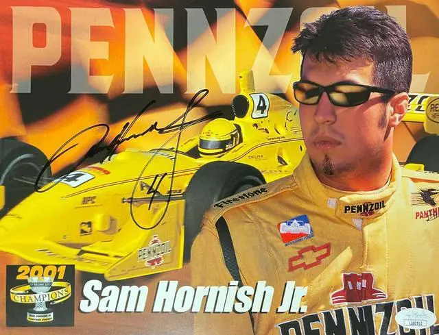 Sam Hornish Jr. began his top-tier racing career in the IndyCar Series, making his driving debut during the 2000 season for PDM Racing. Hornish began driving for Panther Racing the following season, winning eleven races and the 2001 and 2002 series championships over the next three seasons. Sam Hornish Jr. has hand signed this 8.5 x11 Photo. JSA Authentication Sticker #LL60512 and JSA Certificate of Authenticity.