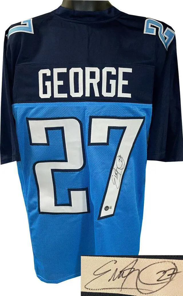 This is a new, in stock, Eddie George signed Tennessee Light Blue unlicensed Custom Stitched Pro Style Football Jersey with fully stitched twill numbers on the front and back and players name plate, there are NO LOGOS, TAGS, BRAND NAMES or PATCHES ON THIS JERSEY & IS NOT AN AUTHENTIC OFFICIALLY LICENSED JERSEY, 100% polyester, made in the Philippines. Size XL (48/50). Private signing 9-12-21 Nashville, Tn. Beckett Witnessed Authentication Sticker with Beckett Certificate of Authenticity