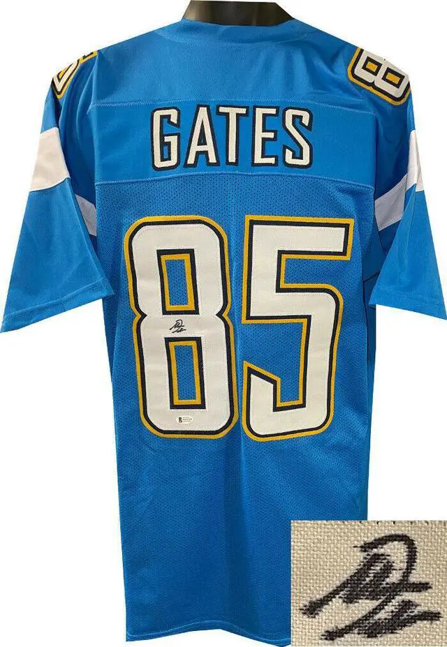 This is a new, in stock, Antonio Gates signed San Diego Light Blue unlicensed Custom Stitched Pro Style Football Jersey with fully stitched twill numbers on the front and back and players name plate, there are NO LOGOS, TAGS, BRAND NAMES or PATCHES ON THIS JERSEY & IS NOT AN AUTHENTIC OFFICIALLY LICENSED JERSEY, 100% polyester, made in the Philippines. Size XL (48/50). Beckett Witnessed Authentication Sticker and Beckett Certificate of Authenticity.