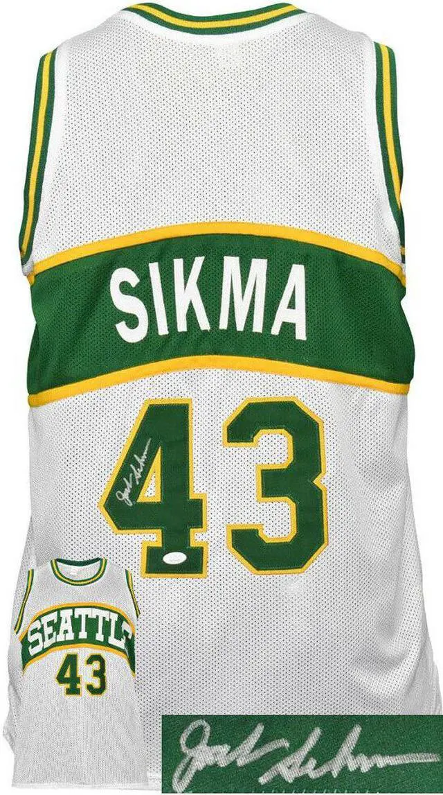 This is a new, in stock, Jack Sikma signed Seattle White Throwback Unlicensed Custom Stitched pro Basketball Jersey with HOF 15 inscription with fully stitched twill numbers on the front and back, there are NO LICENSED TEAM LOGOS, TAGS, BRAND NAMES or PATCHES ON THIS JERSEY & IS NOT AN AUTHENTIC OFFICIALLY LICENSED JERSEY, 100% polyester, made in the Philippines. Size XL (48/50). JSA Witnessed Authentication Sticker with JSA Certificate of Authenticity