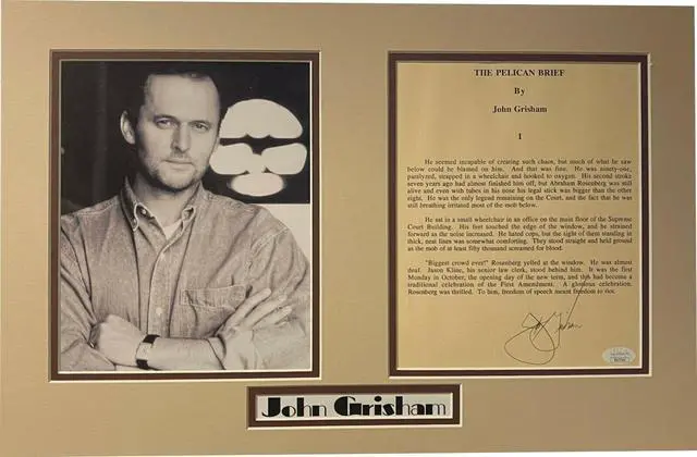 John Grisham is an American novelist and attorney, best known for his popular legal thrillers. John Grisham has hand signed this The Pelican Brief Page 1 w/ 8x10 Photo Matted to 13x20. JSA Authentication Sticker #SS17743 and JSA Certificate of Authenticity.