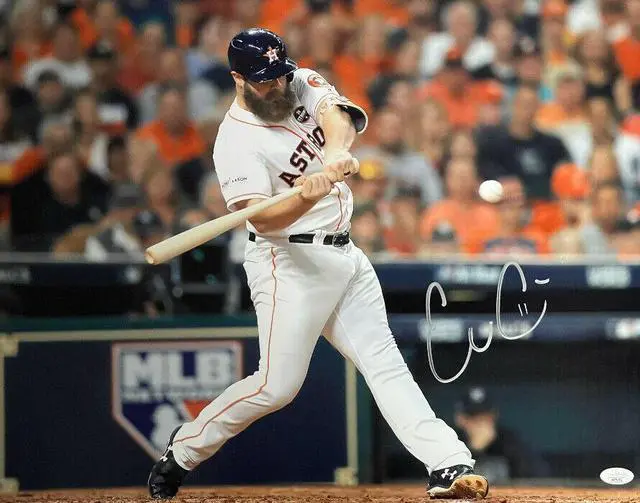 Evan Gattis is an American former professional baseball designated hitter and catcher. He became the Braves' primary catcher in 2014, but was traded to the Astros before the 2015 season. He later won the 2017 World Series with the Astros over the Los Angeles Dodgers. Evan Gattis has hand autographed this Houston Astros 16x20 Photo. JSA Authentication Sticker and JSA Certificate of Authenticity.