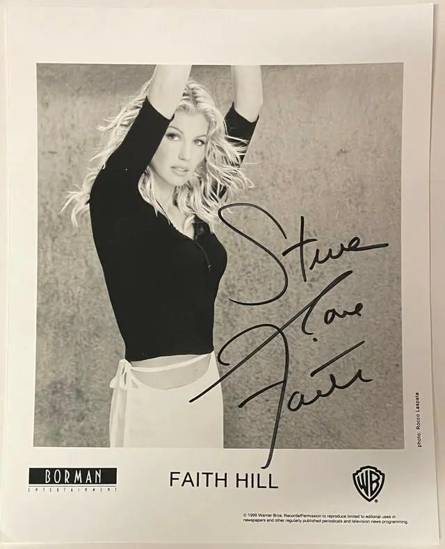 Faith Hill is an American singer and record producer. She is one of the most successful country music artists of all time, having sold more than 40 million albums worldwide. Hill is married to American singer Tim McGraw, with whom she has recorded several duets. Hill has won five Grammy Awards, 15 Academy of Country Music Awards, six American Music Awards, and several other awards. Faith Hill has hand signed this 1999 Warner Brothers Records Glossy 8x10 Photo with Love, To Steve personalized. Certificate of Authenticity from Athlon Sports Collectibles