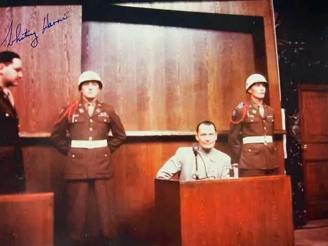 For his work in the Nuremberg trials, Harris was decorated with the Legion of Merit. Whitney Harris has hand signed this 1945-46 WWll Nuremberg Trials Vintage Color 8x10 photo, pristine blue full signature. PSA Authentication Sticker and Certificate Of Authenticity #AD55341. Very rare signature
