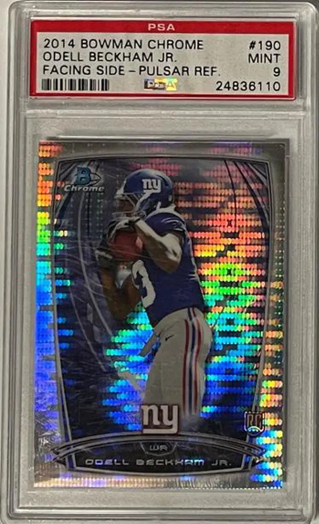 This is an Odell Beckham, Jr. New York Giants 2014 Bowman Chrome Pulsar Refractor Rookie Card (RC) #190- LTD 220/271- PSA Graded 9 Mint. Image of actual item instock - as shown.