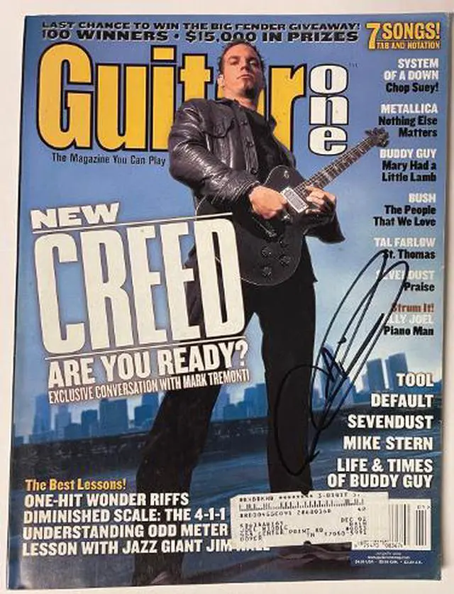 Mark Tremonti is an American musician best known for his tenures with Creed and Alter Bridge. He is a founding member of both bands, and has also collaborated with many other artists over the years. Since his early years with Creed, Tremonti has received positive recognition as a guitarist and songwriter and has received a number of accolades, including one Grammy Award. Mark Tremonti has hand signed this January 2002 Guitar One Full Magazine. Beckett Review Order ID #29881 and Review Order Item ID #35389. Handling/condition as shown.