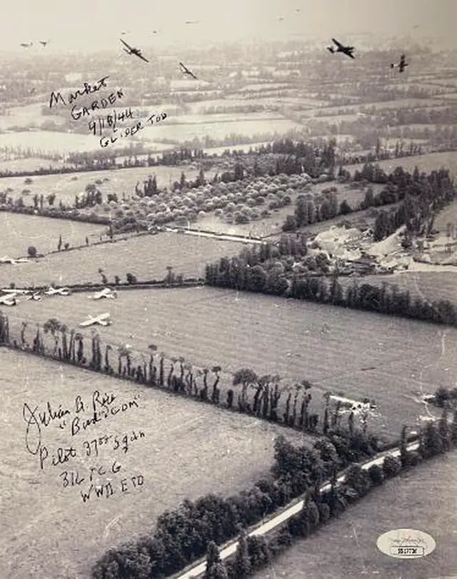 Julian "Bud" Rice served as a C-47 pilot of the 37th Troop Carrier Squadron, and along with 800 other pilots, participated in D-Day, the largest invasion ever attempted. In all, Rice flew more than 700 daily transport and combat missions during the War. Julian "Bud" Rice has hand signed this 8x10 Photo with Pilot 37th Squadron WWII Market Garden inscriptions. JSA Authentication Sticker #SS17736 and JSA Certificate of Authenticity.