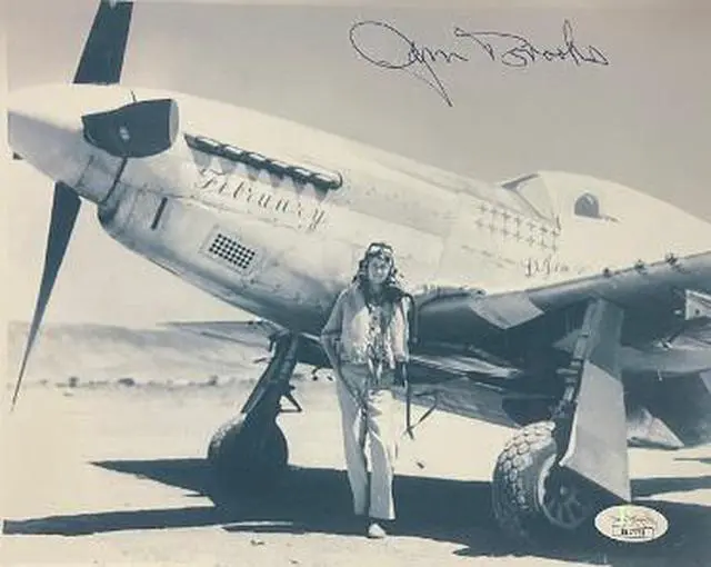 During World War II, James Brooks became a U. S. Army Air Forces DOUBLE ACE, credited with shooting down 13 enemy aircraft in aerial combat. During the Korean War he flew an F-86 with the 4th Fighter Group, and participated in the first major all-jet air battle of that war in December 1950. James "Jim" Brooks has hand signed this Vintage B&W 8x10 Photo. JSA Authentication Sticker #SS17731 and JSA Certificate of Authenticity.