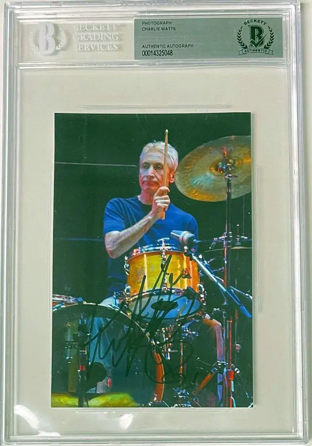 Charles Watts was an English musician who achieved international fame as the drummer of the Rolling Stones from 1963 until his death in 2021. In 1989, Watts was inducted into the Rock and Roll Hall of Fame. In 2004, he was inducted into the UK Music Hall of Fame with the Rolling Stones. He is often regarded as one of the greatest drummers of all time. Charlie Watts has hand signed this 4X6 Photo. Beckett/BAS Encapsulated 00014325048