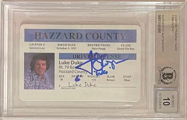 Coltrane. Tom Wopat has hand signed this Luke Duke Hazzard County Rep Driver's License with Luke Inscription. Beckett/BAS Encapsulated and Graded 10 Autograph.