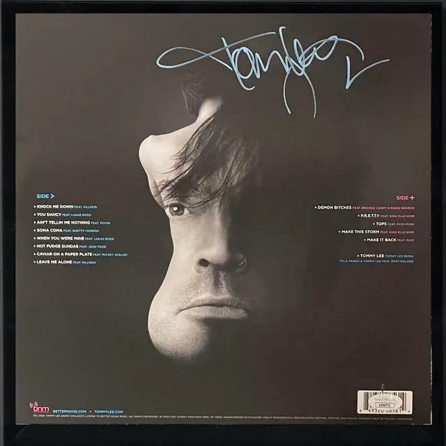 Stepping out from behind the kit, Lee took the role of producer, creating tracks that range sonically from hip-hop, to funk, industrial, electro, and even dream pop. Tommy Lee has hand signed this 2020 Andro Limited Edition Pink + Blue Album Cover/LP/Vinyl/Record. Deluxe black wood frame as shown approx 12.5" x 12.5" x 0.75".