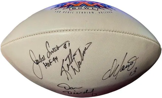 Dan Marino, Dan Dierdorf, Jackie Smith plus one more have all hand signed this Wilson NFL Tagliabue SB XXX Logo Football Beckett Review. Beckett Authentication Signature Review Order ID: 44928, Order Item ID #53637. Black full signatures, Marino #13 Inscribes, Smith #81 & HOF 94 Inscribed