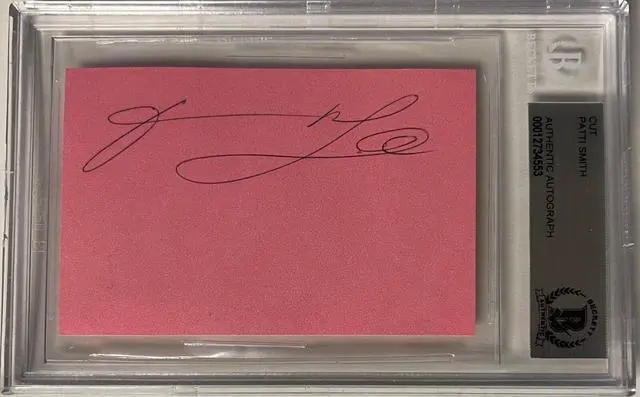 Patricia (Patti) Lee Smith is an American singer-songwriter, musician, author, and poet who became an influential component of the New York City punk rock movement with her 1975 debut album Horses. Called the "punk poet laureate", Smith fused rock and poetry in her work. Her most widely known song is "Because the Night", which was co-written with Bruce Springsteen. It reached number 13 on the Billboard Hot 100 chart in 1978. Patti Smith has hand signed this 2x 3.5 Cut Signature. BAS/Beckett Encapsulated 0012734553.