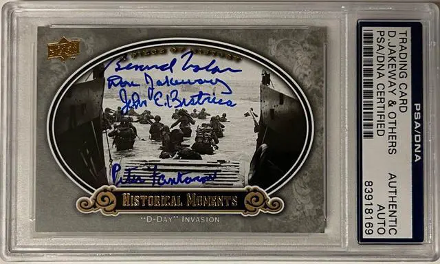 At 6:30 am on 6/6/44, Allied forces of American, Canadian and English troops landed in Normandy, France, in the single largest seaborne invasion in history, taking German-held land in the north of France in a pivotal World War II battle. The Allies took the beaches, a precursor to the German's later surrender. John Bistrica/Peter Fantacone/Don Jakeway/ Bernard Nolan have all 4 hand signed this 1944 D-Day Invasion Upper Deck Historical Moments Card #161. PSA Authentic Autograph Encapsulated #83918169