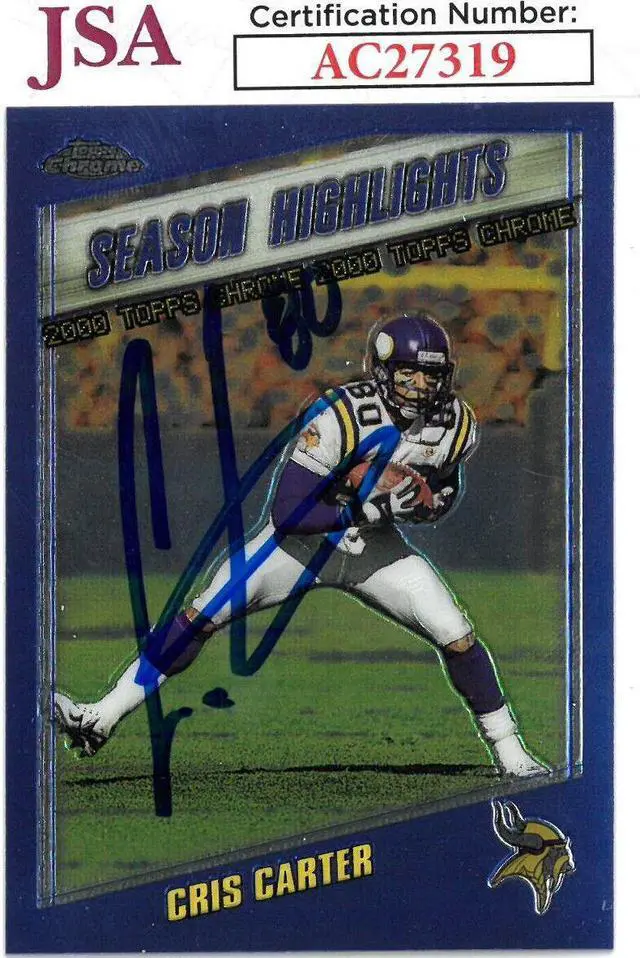 This is a Cris Carter signed 2000 Topps Chrome Football Card #193- JSA. JSA Authentication Sticker #AC27319 and JSA Certificate of Authenticity. Image of actual item instock - as shown.