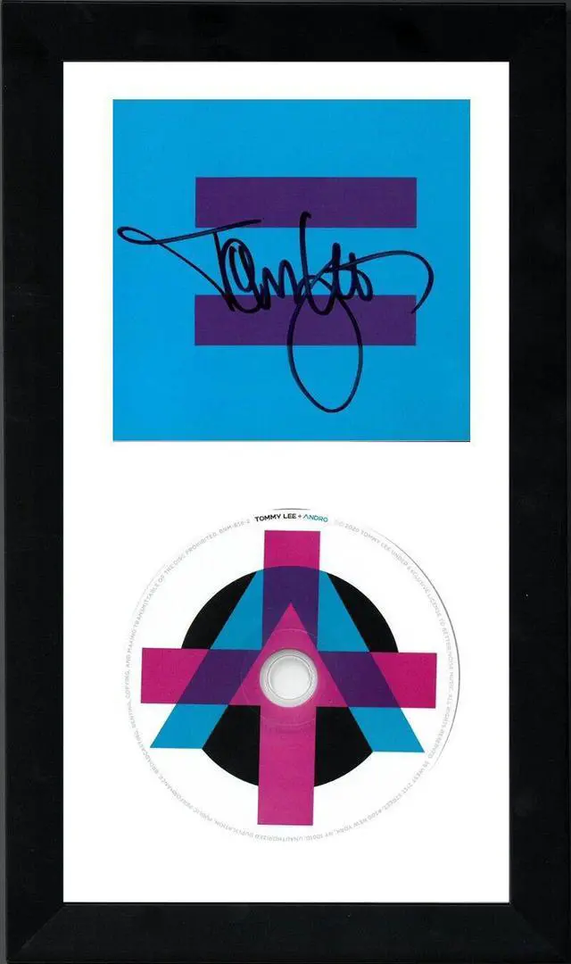 Stepping out from behind the kit, Lee took the role of producer, creating tracks that range sonically from hip-hop, to funk, industrial, electro, and even dream pop. Tommy Lee has hand signed this 2020 Andro Album Cover Booklet w/ CD. Certificate of Authenticity from Athlon Sports Collectibles. Handling/condition as shown. Custom White Mat and Black Frame as shown to overall size 6.5 inch x 12 inch