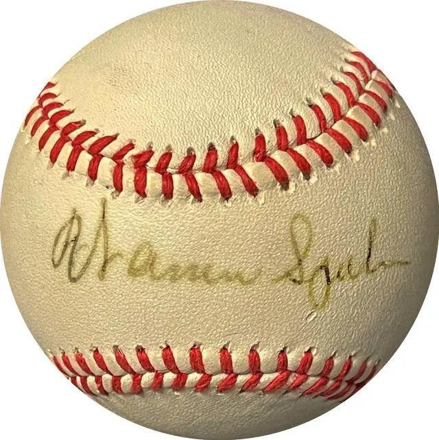 Warren Spahn played his entire 21-year baseball career in the National League. He won 20 games each in 13 seasons, including a 23-7 record when he was age 42. Spahn was the 1957 Cy Young Award winner, and was the runner-up three times. He was elected to the Baseball Hall of Fame in 1973, with 83% of the total vote. Warren Spahn (deceased) has hand this RONL Rawlings Official National League Baseball (Bart Giamatti President). Certificate of Authenticity from Athlon Sports Collectibles. Exact Ball as shown. Toned/bleed sig, sold as is, no returns.