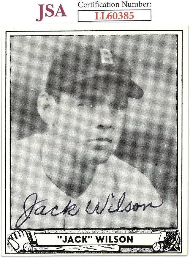 This is a Jack Wilson signed 1986 Reprint 1940 Ball Card #31 (On Card Auto/Boston Red Sox). JSA Authentication #LL60385 and JSA Certificate of Authenticity. Image of actual item instock - as shown.