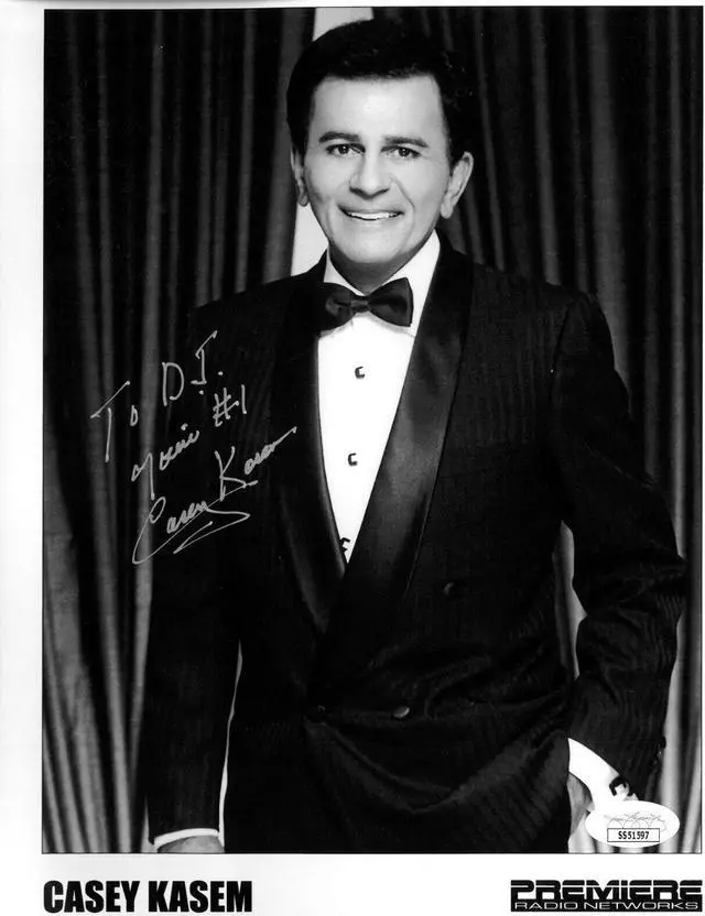 Casey Kasem was an American DJ, music historian, radio personality, and actor. He was the host of several music radio countdown programs, notably American Top 40 from 1970 until his retirement in 2009. He also provided the voice of Norville "Shaggy" Rogers in the Scooby-Doo franchise from 1969 to 1997, and again from 2002 until 2009. Casey Kasem has hand signed this B&W 8x10 Photo with to DJ You're #1 inscription. JSA Authentication #SS51597 and JSA Certificate of Authenticity.