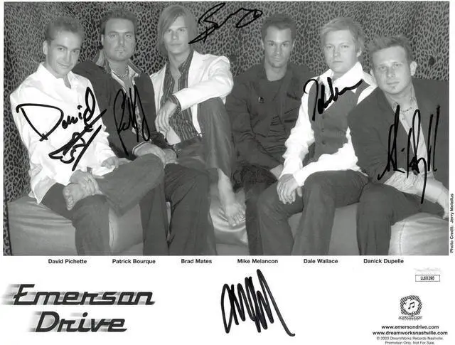 United States were: "I Should Be Sleeping", "Fall into Me", and "Last One Standing". This 8.5 x10 Emerson Drive B&W Photo is hand signed by 6 members-David Pichette, Patrick Bourque, Brad Mates, Mike Melancon, Dale Wallace and Danick Dupelle. JSA Authentication #LL60290 and JSA Certificate of Authenticity. Upper Left bend/crease/sold as is/no returns.