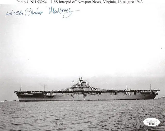 Charles Mallory has hand signed this 8x10 Photo of the USS Intrepid on August 16 1943. JSA Authentication Sticker #SS17642 & JSA Certificate of Authenticity