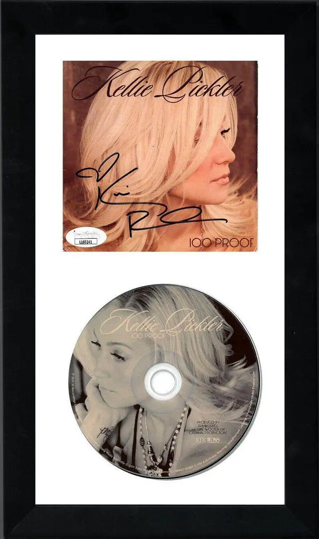 Kellie Pickler is an American country music artist, actress and television personality. Pickler gained fame as a contestant on the fifth season of American Idol and finished in sixth place. Kellie Pickler has hand signed this 2011 100 Proof Cover Booklet w/ CD & Case. JSA Authentication #LL60241 and JSA Certificate of Authenticity. Handling/condition as shown. Custom White Mat and Black Frame as shown to overall size 6.5 inch x 12 inch