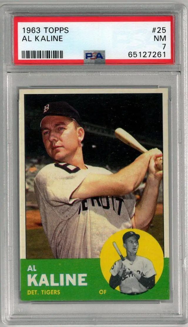 This is an Al Kaline 1963 Topps Baseball Card #25- PSA Graded 7 NM (Detroit Tigers). Image of actual item instock - as shown. New PSA Label-Slabbed September 2022